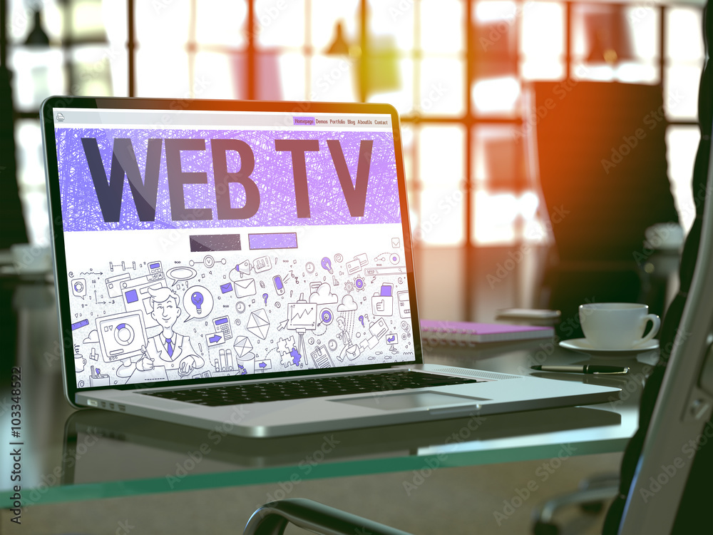 The watermark will not be included on Wall mural.: Modern workplace with laptop showing landing page in doodle design style with text web tv - toned ima