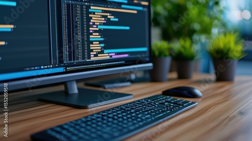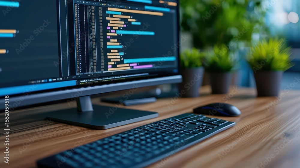 The watermark will not be included on Wall mural.: Modern workspace with computer screen displaying code, keyboard, mouse and indoor plants for tech en