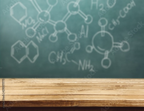 The watermark will not be included on Wall mural.: Molecule models and formulas on blackboard background