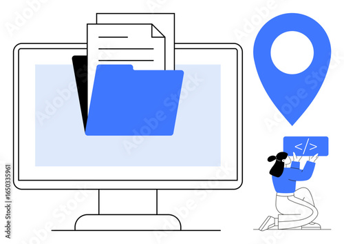 Wall mural : Monitor with folder and documents, coding woman holding code panel, location pin - ideal for file sto