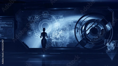 Wall mural monitoring internet activity via satellite network from earth orbit.