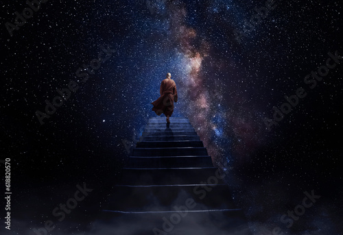 Wall mural : Monk observing the universe at the end of the stairs - ai generative