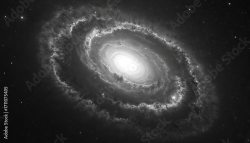 Wall mural monochrome spiral galaxy with bright core and swirling arms in deep space. stars and nebulae create