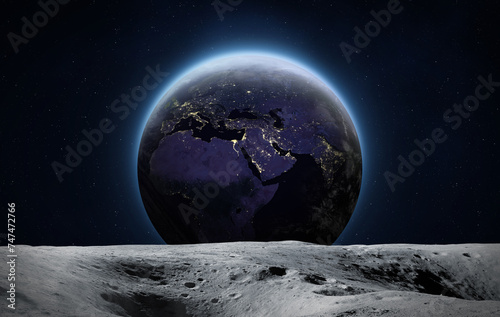Wall mural moon and night earth. moon surface with craters. view of planet earth from the surface of the moon.