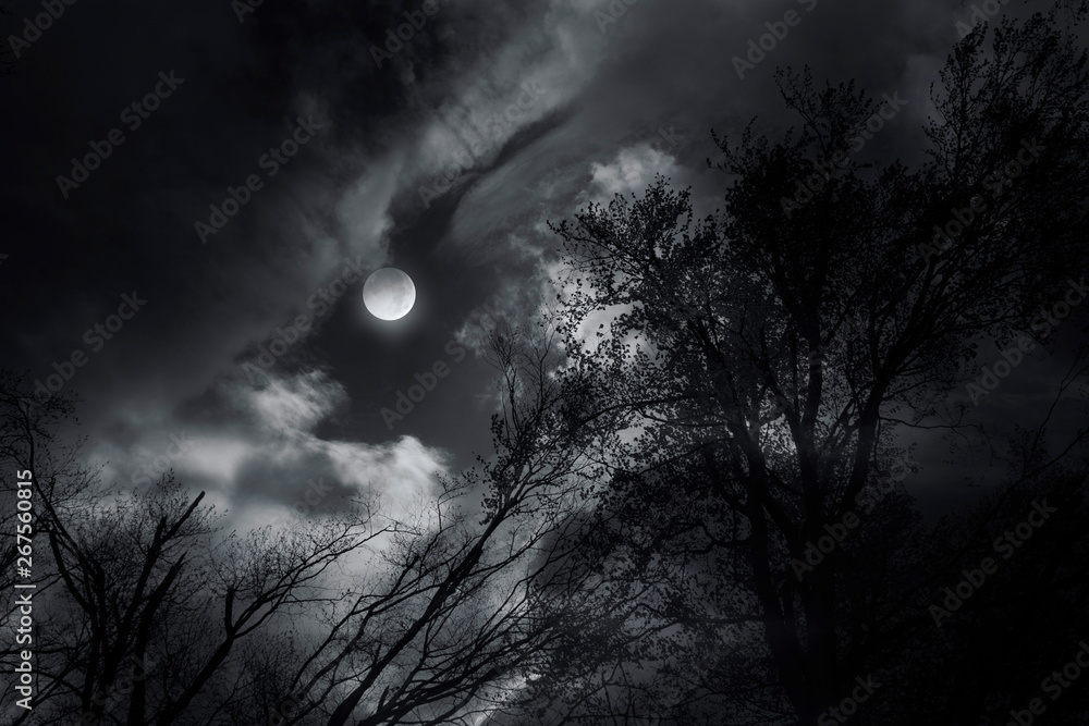 The watermark will not be included on Wall mural.: Moon shining through clouds at midnight and trees blown by wind in dark gothic scene
