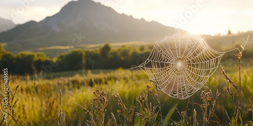 The watermark will not be included on Wall mural.: Morning spider web at the mountain, showcasing the intricate design of a spider web glistening in th
