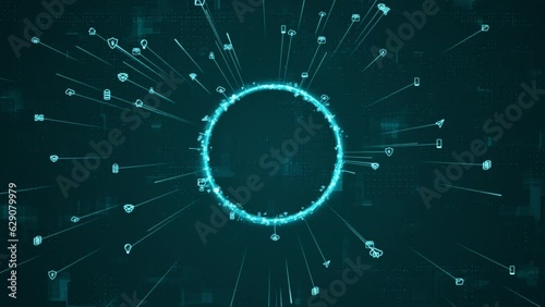 Wall mural motion graphic of blue digital particle ring rotation around logo with ai icon spread and line linke