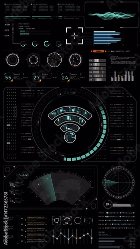 Motion graphic of blue digital wifi logo with head up display (hud ui) panel and futuristic technoloWall mural