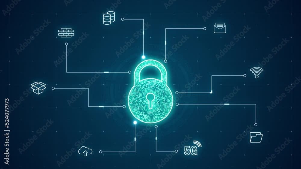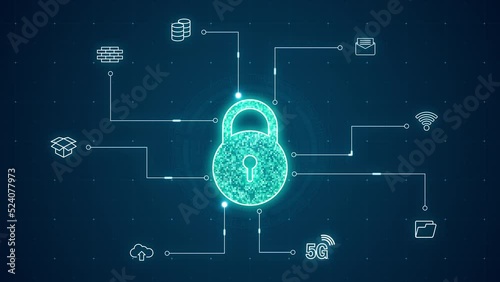 Motion graphic of blue security key with line connection and data transfer to futuristic icon technoWall mural