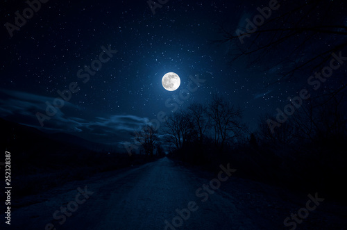 Wall mural mountain road through the forest on a full moon night. scenic night landscape of dark blue sky with