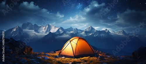 Mountain tent illuminated by starry sky copy space image place for adding text or designWall mural