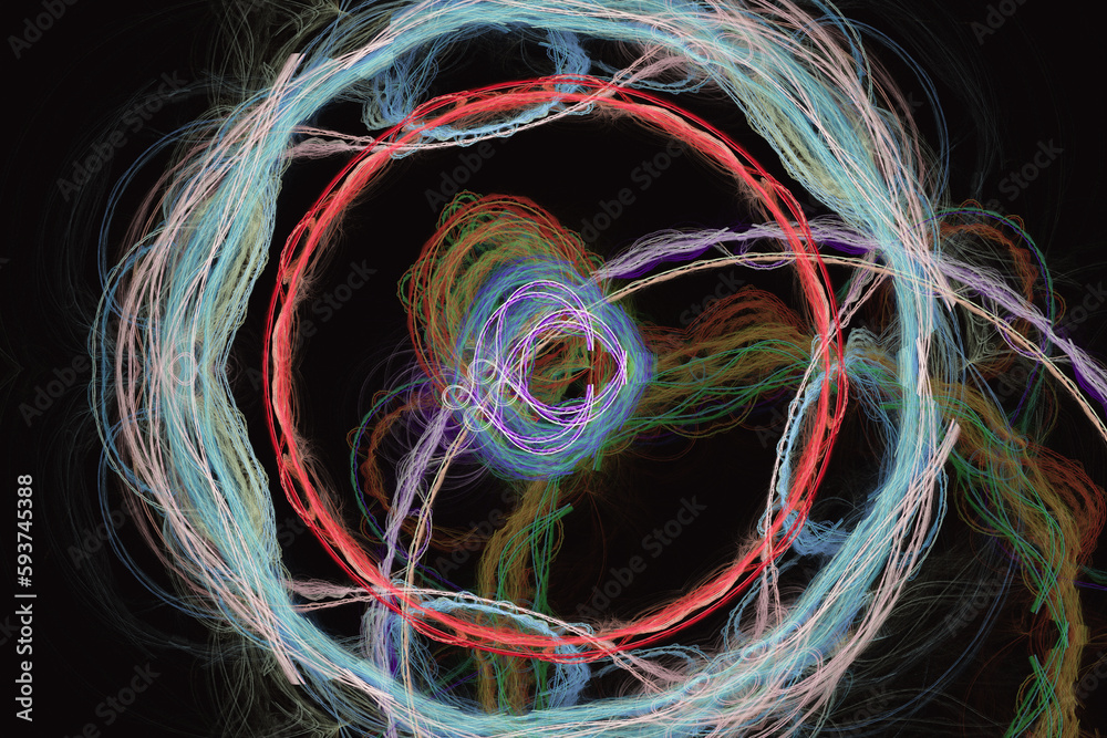 Wall mural : Multi-colored bright round pattern of crooked waves from threads on a black background - abstract fra