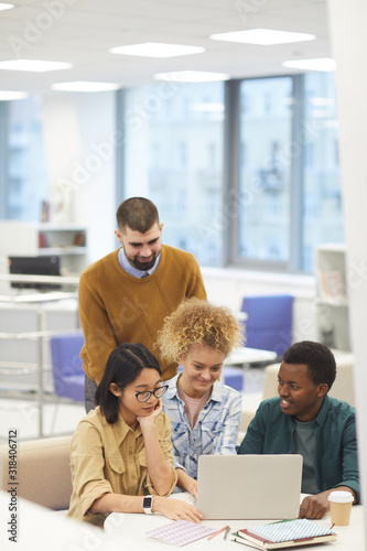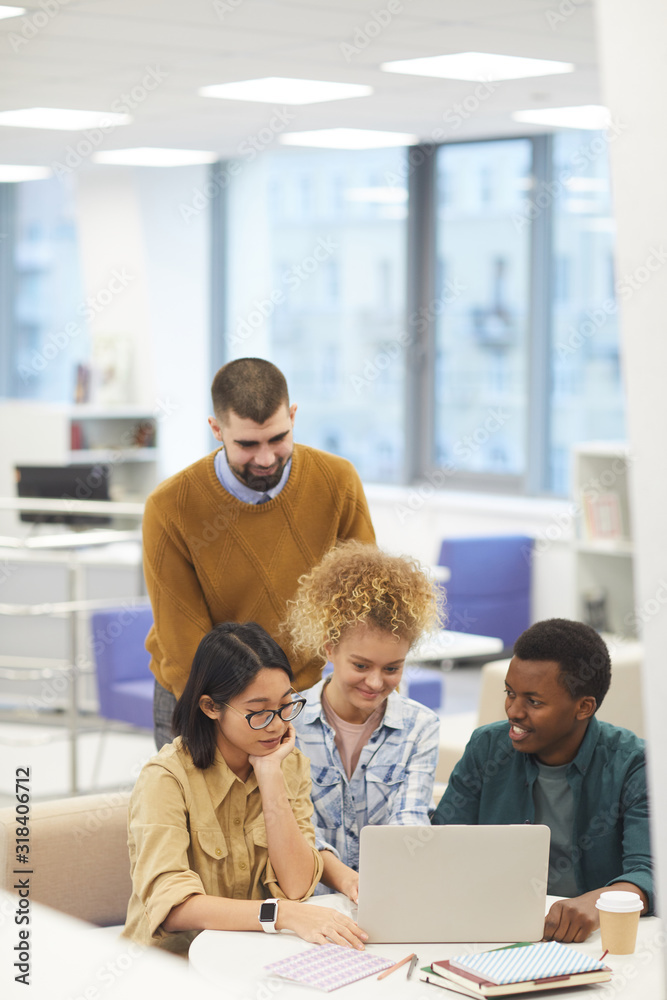 The watermark will not be included on Wall mural.: Multi-ethnic group of cheerful students using laptop together while working on project in library, c