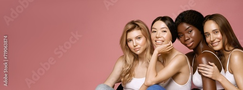 Wall mural : Multi ethnic group of womans with diffrent types of skin sitting together and looking on camera - div