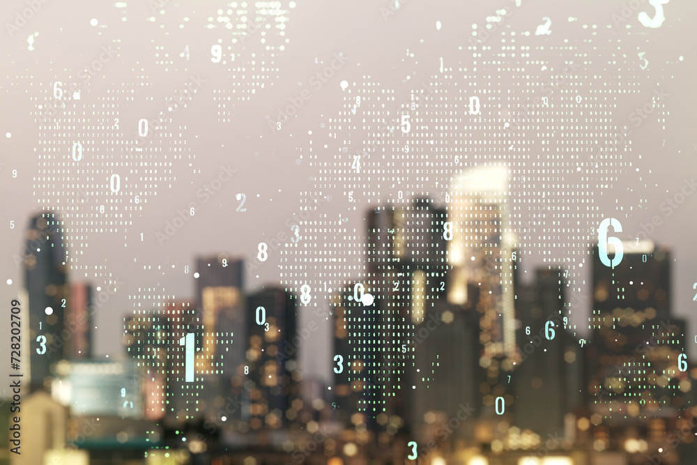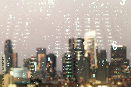 Wall mural : Multi exposure of abstract creative coding sketch and world map on blurry skyline background, artifi