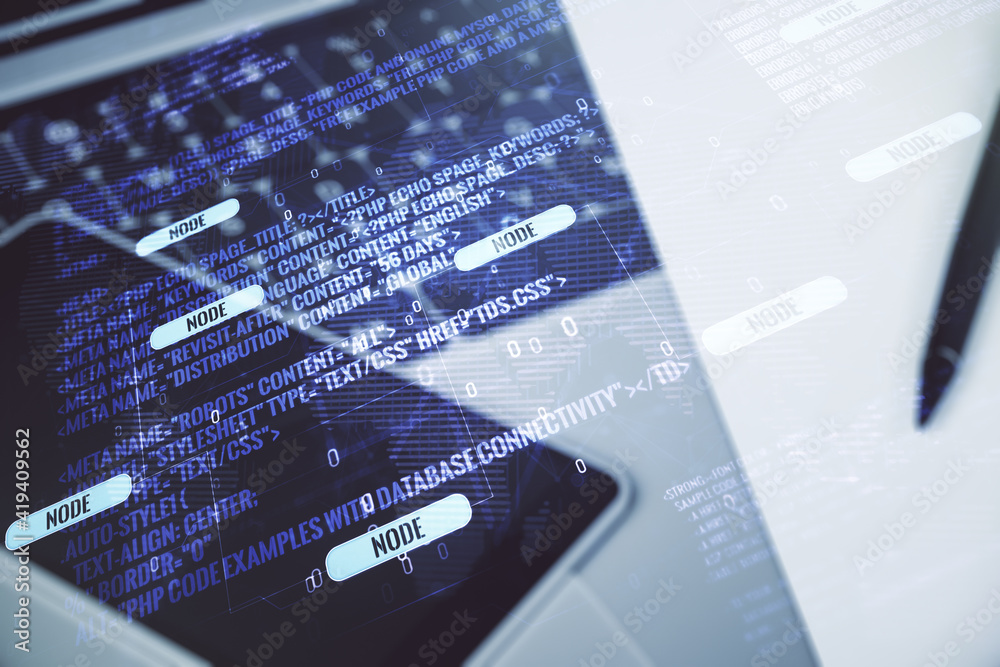 Multi exposure of abstract creative coding sketch with world map on modern laptop background, artifiWall mural