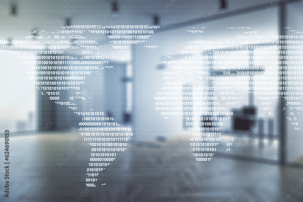 Multi exposure of abstract graphic world map on a modern furnished classroom background, big data anWall mural