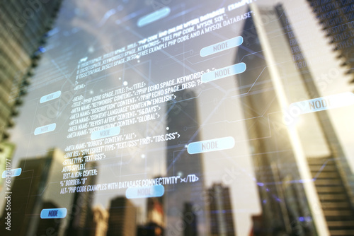 Wall mural multi exposure of abstract programming language hologram on blurry cityscape background, artificial
