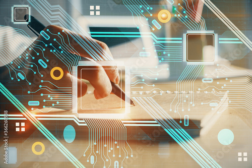Wall mural multi exposure of woman's hands on background with technology and digital coding icons. data develop