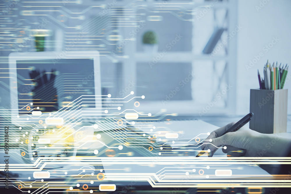 Wall mural multi exposure of woman hands on background with technology coding hologram. data concept. - Wall murals Wall mural multi exposure of woman hands on background with technology coding hologram. data concept. - Wall murals