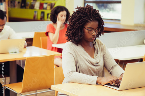 The watermark will not be included on Wall mural.: Multiethnic adult students working on computers in public library - people sitting at desks and using
