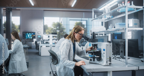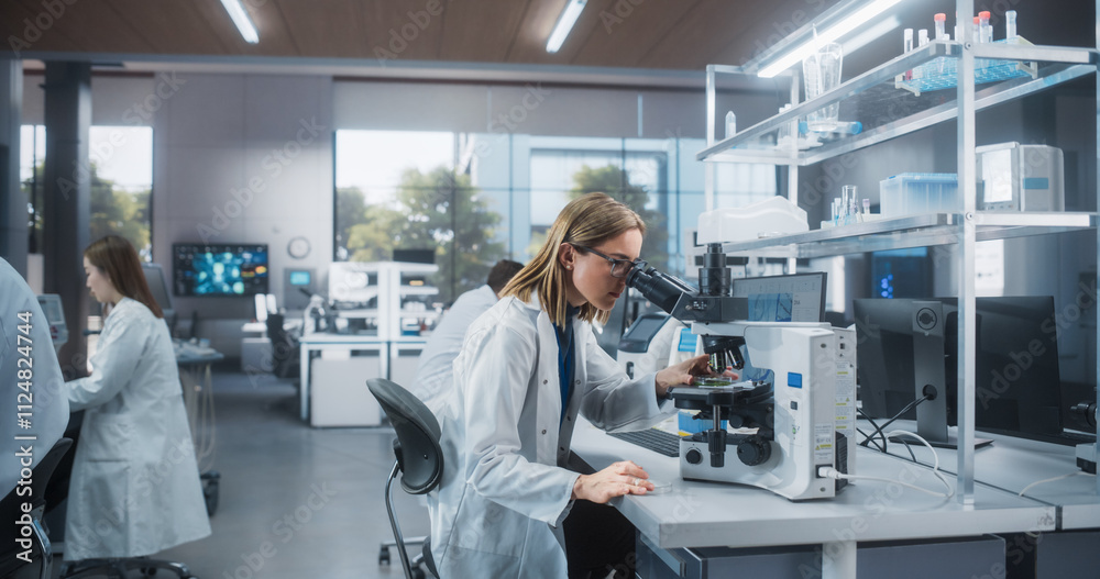 The watermark will not be included on Wall mural.: Multiethnic biotechnologists studying genetic samples under a microscope and researching data on com