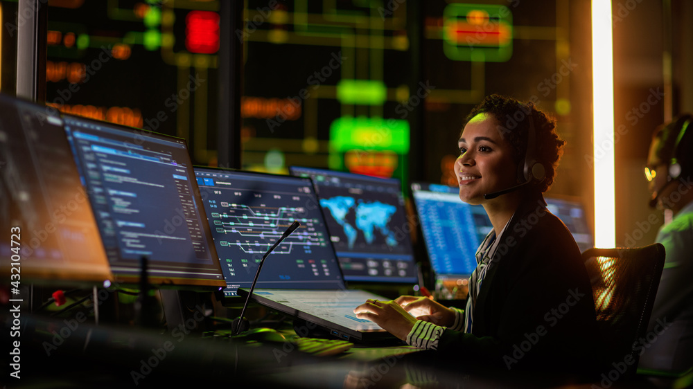 The watermark will not be included on Wall mural.: Multiethnic female it technical support specialist talking with a client in headphones and working o
