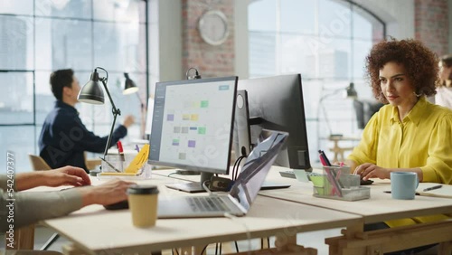 The watermark will not be included on Wall mural.: Multiethnic group of creative colleagues working on computers during day in a modern bright office -