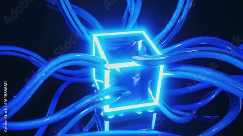 The watermark will not be included on Wall mural.: Multiple blue cables are wrapping around a glowing cube emitting a bright neon light, creating a cap