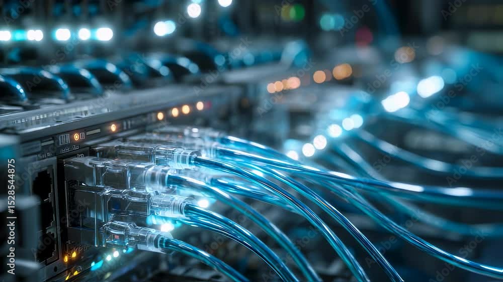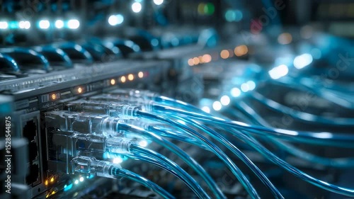 The watermark will not be included on Wall mural.: Multiple blue network cables are connected to a server rack, transferring data as indicated by blink