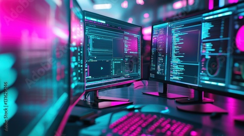 The watermark will not be included on Wall mural.: Multiple computer screens displaying lines of code in a dark room with pink and blue lighting -