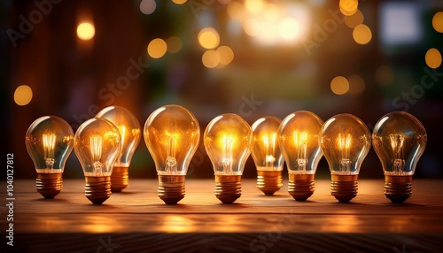Wall mural multiple light bulbs resting on a wooden table generative ai - Wall murals Wall mural multiple light bulbs resting on a wooden table generative ai - Wall murals