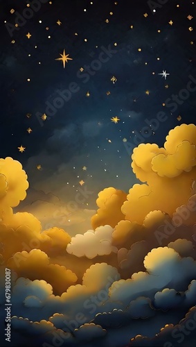 The watermark will not be included on Wall mural.: Mustard yellow 3d layer gradient mystical sky with clouds and stars phone background wallpaper, ai g