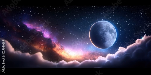 Wall mural : Mysterious galaxy and moon background with a large moon, distant stars, and swirling nebula clouds -