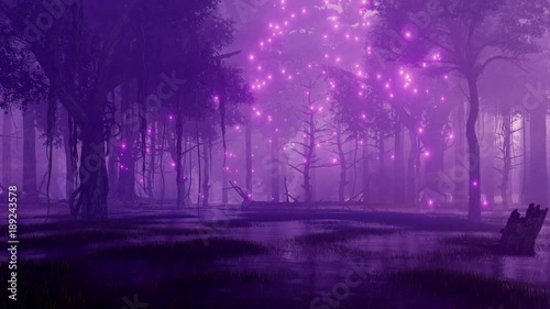 Wall mural mysterious marshy forest with supernatural fairy firefly lights soaring in the air at dark misty nig