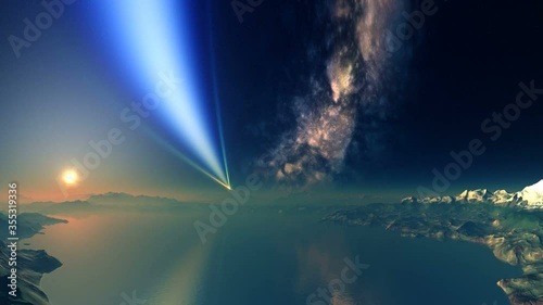 Wall mural mysterious rays on an alien planet. above the foggy horizon a mysterious object emits bright rays. a