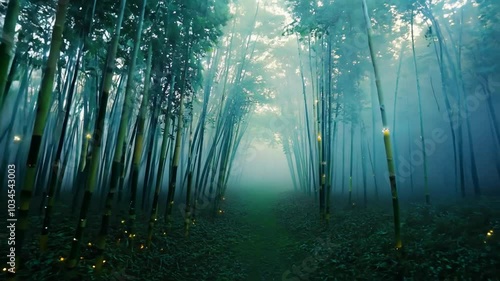 Wall mural : Mystical bamboo forest path lit by fireflies -