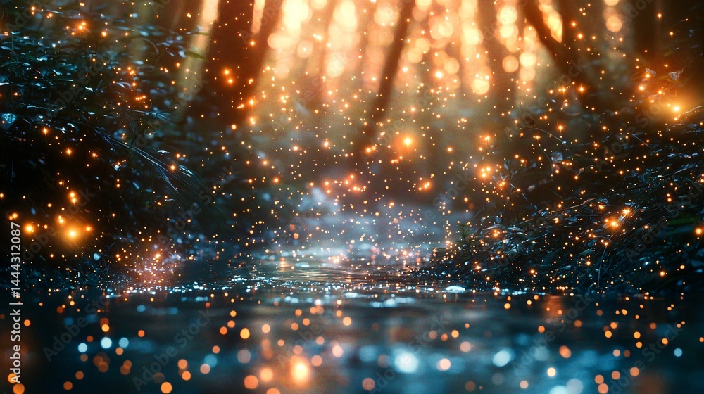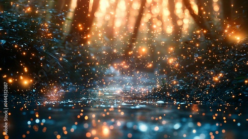 The watermark will not be included on Wall mural.: Mystical dark forest illuminated by bright lights creating a surreal dreamlike environment of enchan
