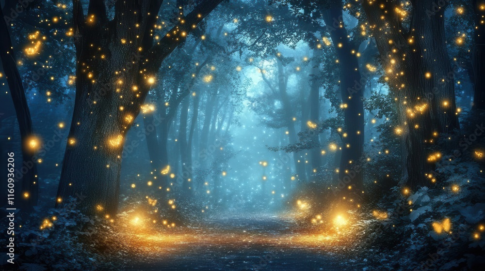 The watermark will not be included on Wall mural.: Mystical foggy forest path illuminated by moonlight creating ethereal atmosphere with glowing bokeh