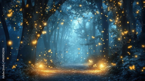 Wall mural : Mystical foggy forest path illuminated by moonlight creating ethereal atmosphere with glowing bokeh