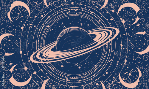Wall mural mystical space background with planet saturn and moon on blue background with stars, flat design for