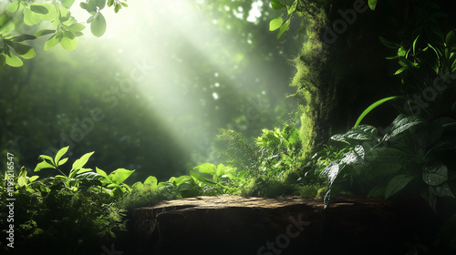 The watermark will not be included on Wall mural.: Natural mockup with stone platform and forest background for product display