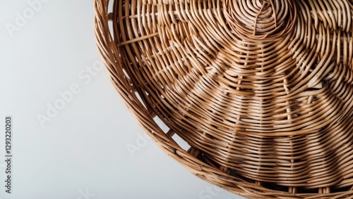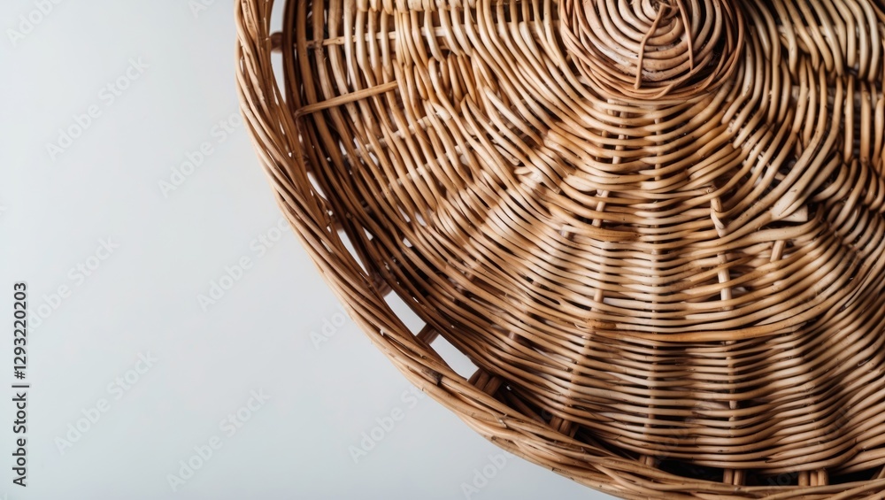Wall mural : Natural wicker basket close-up displaying intricate weave pattern against a bright white background