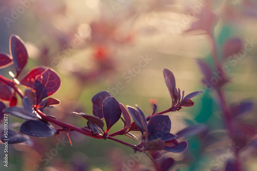 The watermark will not be included on Wall mural.: Nature background border with bright red leaves on abstract bokeh and sunlight, soft focus backgroun