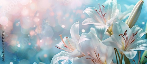 Wall mural nature flower background. flowering white lilies on pastel background. blue toned. horizontal banner