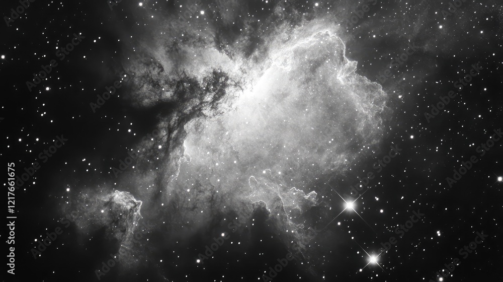 The watermark will not be included on Wall mural.: Nebula in deep space captured in black and white featuring stars and cosmic dust with copy space for