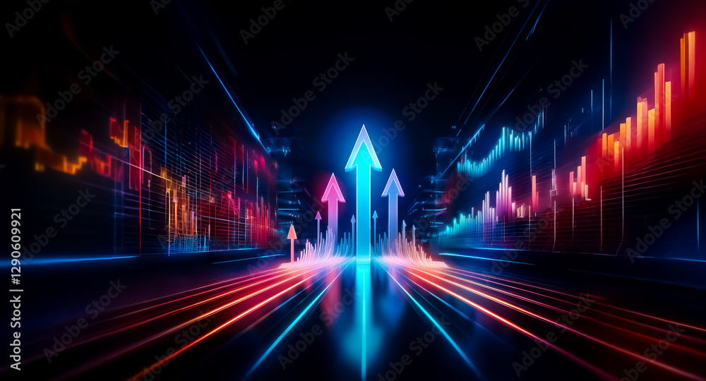 Wall mural neon arrows ascend amid glowing graph lines in a futuristic cityscape, symbolizing progress and upwa - Wall murals Wall mural neon arrows ascend amid glowing graph lines in a futuristic cityscape, symbolizing progress and upwa - Wall murals