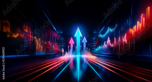 The watermark will not be included on Wall mural.: Neon arrows ascend amid glowing graph lines in a futuristic cityscape, symbolizing progress and upwa