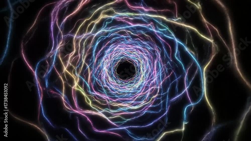 The watermark will not be included on Wall mural.: Neon candy swirl line effect - this video features a vibrant swirl of neon lines against a black bac