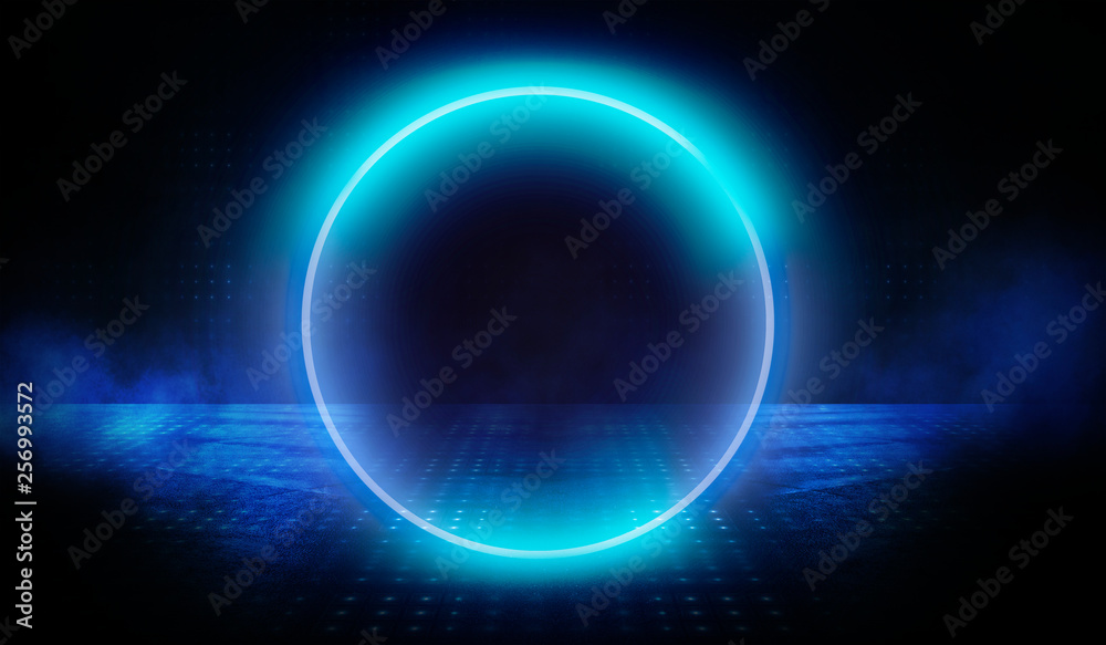 The watermark will not be included on Wall mural.: Neon circle, neon lights - neon circle with the center of a dark empty scene with spotlights - abstrac